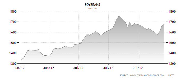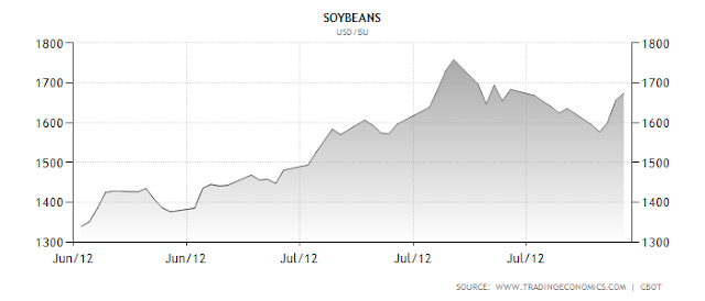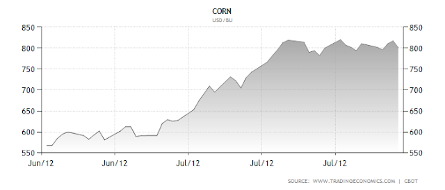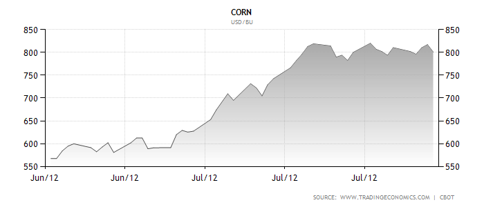 Indeed, food commodity prices have already spiked as a result of the current drought. Corn and soybean prices are up about 40% since June, and are only expected to increase further: