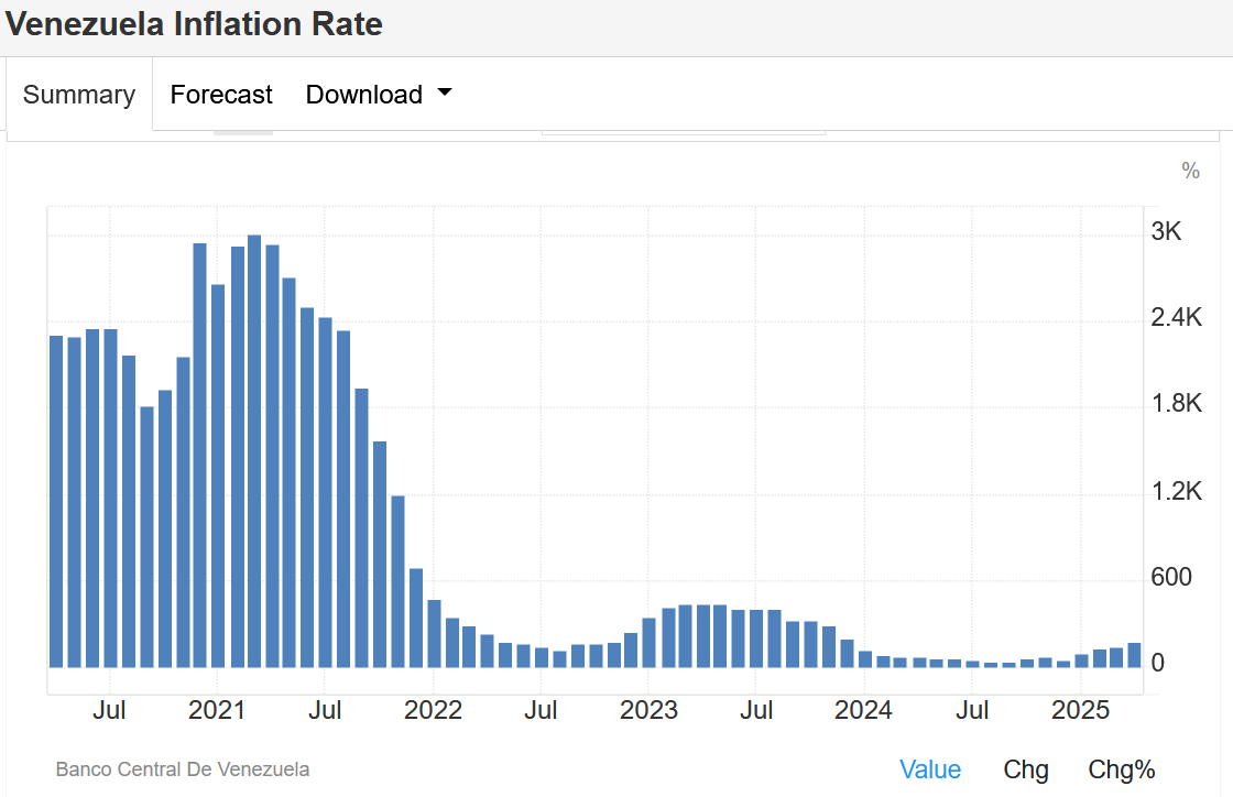The CPI inflation Rate in Venezuela increased to 172 percent per annum in April from 136 percent in March of 2025. Sounds high? However, it averaged 3,527 percent from 1973 until 2025, reaching an all time high of 344,509 percent in February of 2019. So current inflation rates are relatively muted.