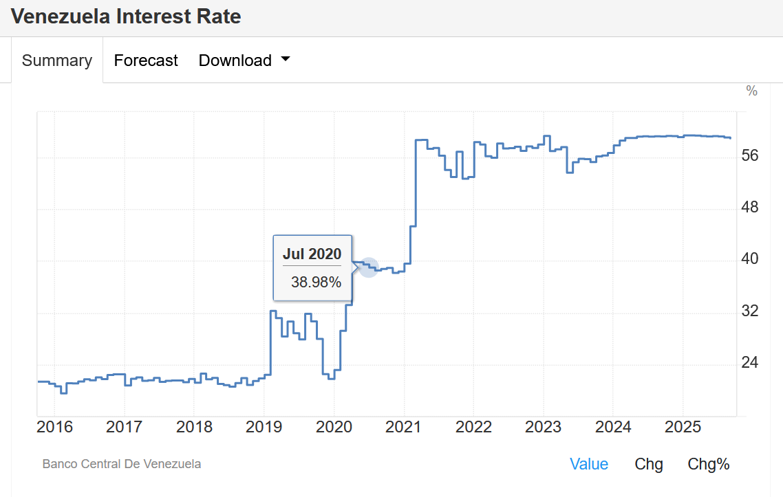 The benchmark interest rate in Venezuela was last recorded at 58.95 percent. The official interest rate in Venezuela averaged 24.36 percent from 1998 until 2025, reaching an all time high of 83.73 percent in February of 2002 and a record low of 12.79 percent in April of 2006. Such high interest rates mean that bank loans become impossible, bank deposits are trapped and the Velocity of Money falls dramatically.