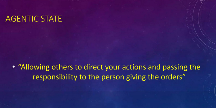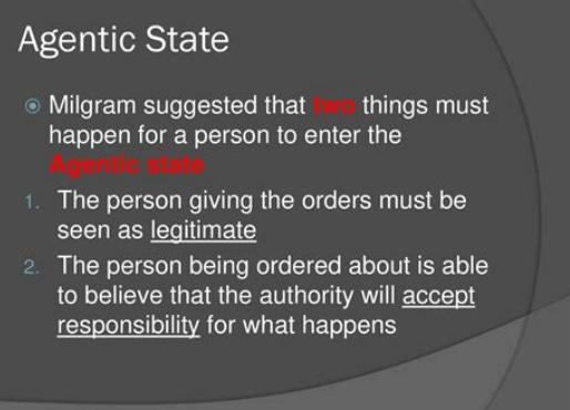 Milgram proposed the idea of an “agentic state” to explain why individuals might act against their own conscience when under the command of an authority figure. He distinguished this from an “autonomous state”: