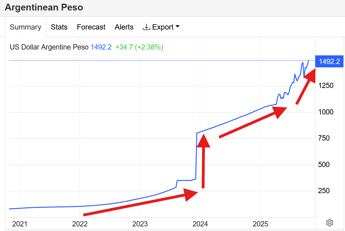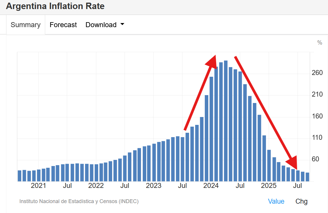 When Milei came into power, he devalued the Argentine Peso, the local currency. And it has collapsed further since then against the US Dollar, guaranteeing CPI Hyperinflation. The US Dollar has been tolerated inside Argentina for decades (a cardinal sin of national financial management). Thus, it has now become the readily available alternative currency. Hyperinflation of local goods and services is almost guaranteed. BOOM expects this to worsen in future.