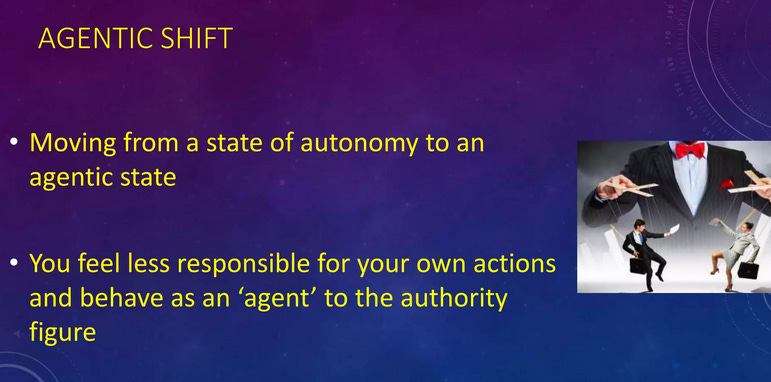 The experiments demonstrated how individuals could enter an AGENTIC STATE (agency) and thereby defer responsibility for their actions to a perceived authority. In the experiments, 65 % – 92 % of the people being studied gave a maximum electric shock to another person when instructed to do so by the Authority figure. Remember those numbers — they are stunning.