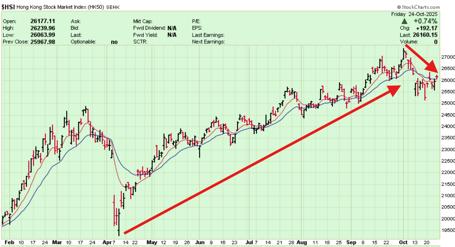 The Shanghai stock market is not showing any signs of technical weakness at present but there is some notable hesitation in the Hong Kong market. Watch both markets closely over the next few weeks. If they begin to decline, take note. Alternatively, if they continue to show strong buyer interest, take note because it may be another excellent point for increased exposure. Time will tell.