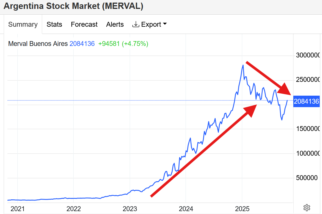 The Merval Stock Index is now falling and has been since the first week of January 2025. It rose dramatically when the new President, Javier Milei, was elected to office in November 2023 with his promises of taking the chainsaw to Government expenditure, abandoning BRICS and sacking many public servants.