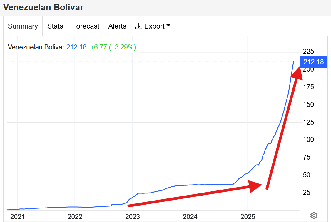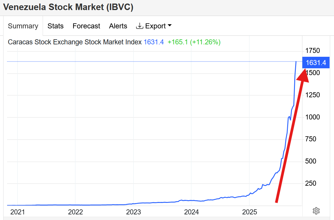 The stock market in Venezuela continues to rocket upwards despite massive economic problems and military threats from US President Donald Trump and the US Secretary of War, Peter Hegseth. This pattern usually emerges when the people of a nation lose faith in their banks and the local currency collapses against the US Dollar (which may be in free circulation as an alternative currency).