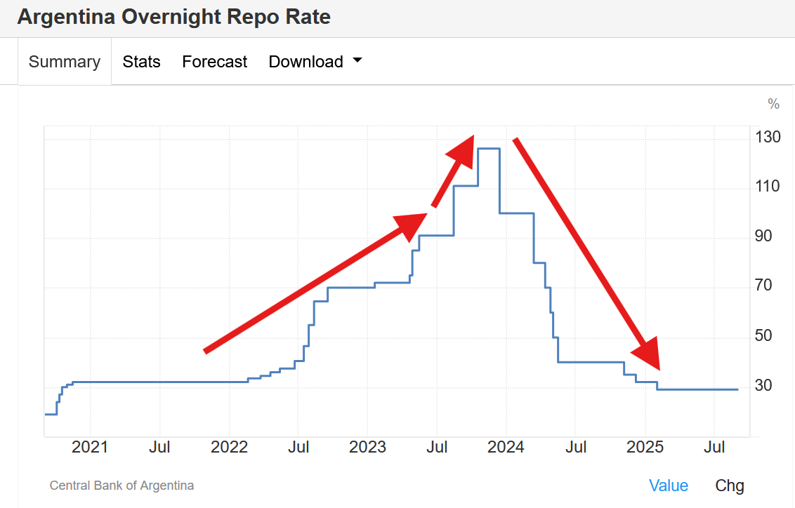 Since Milei came to power in late 2023, there has been a dramatic lowering of the official interest rate from the central bank as CPI inflation has fallen. However, it is still hovering just below 30 % which makes bank loan credit expansion unlikely to happen. This economy is a very long way from repair. It has suffered terribly from Socialist ideology for decades and that disease cannot be reversed easily or quickly. It will take decades of firm economic policies to do that. BOOM suspects that the people of Argentina will not have the patience for such a slow grind. Thus, we can expect violent upheavals and military rule before too long. An invasion from a foreign aggressor is not impossible. Perhaps Marco Rubio is planning ahead with Pete Hegseth? Or perhaps China will come to the rescue peacefully after Milei is removed from power by the people? Who knows?