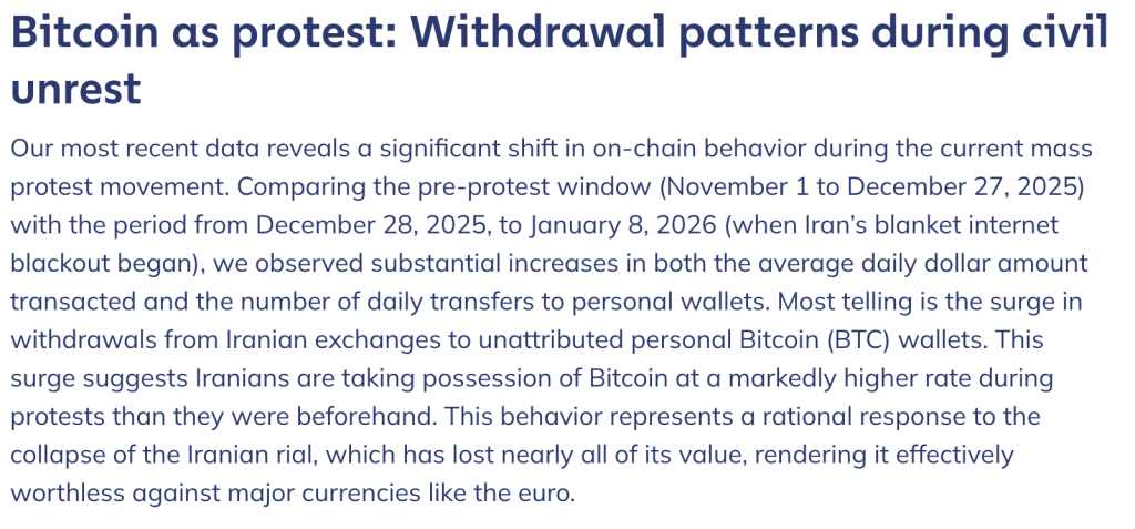 Chainalysis notes that this pattern mirrors Bitcoin adoption during crises elsewhere, where citizens turn to self-custody when trust in state-controlled financial systems breaks down.
