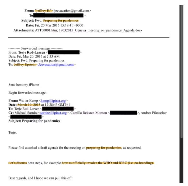 A number of emails in the Epstein files speak of pandemic preparedness. One of them, from March 2015, explicitly invites to discuss “how to officially involve the WHO” for the sake of “co-branding” (it looks like the “product” to “co-brand” is a pandemic).
