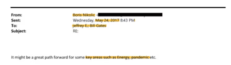In 2017, an email from Boris Nikolic addressed to both Epstein and Gates (four years after the agreement letter about Epstein mediating the rupture between Nikolic and Gates) mentions “pandemic” as a key area for a Donor Advised Fund.