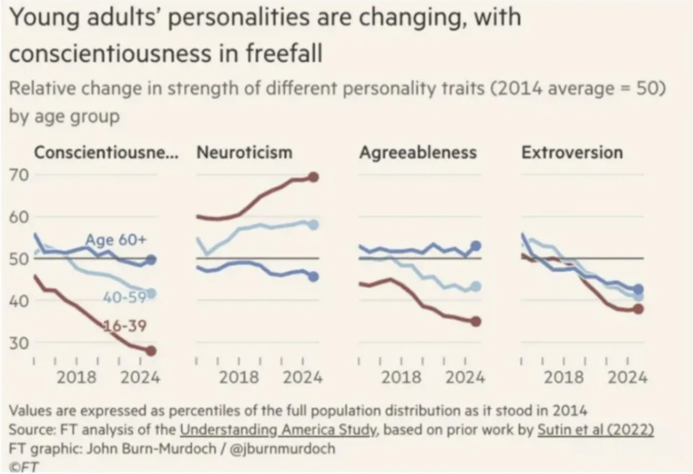 The data proves the conditioning is working. A chart published last week by Financial Times data reporter John Burn-Murdoch shows young adults’ personalities changing in real-time.