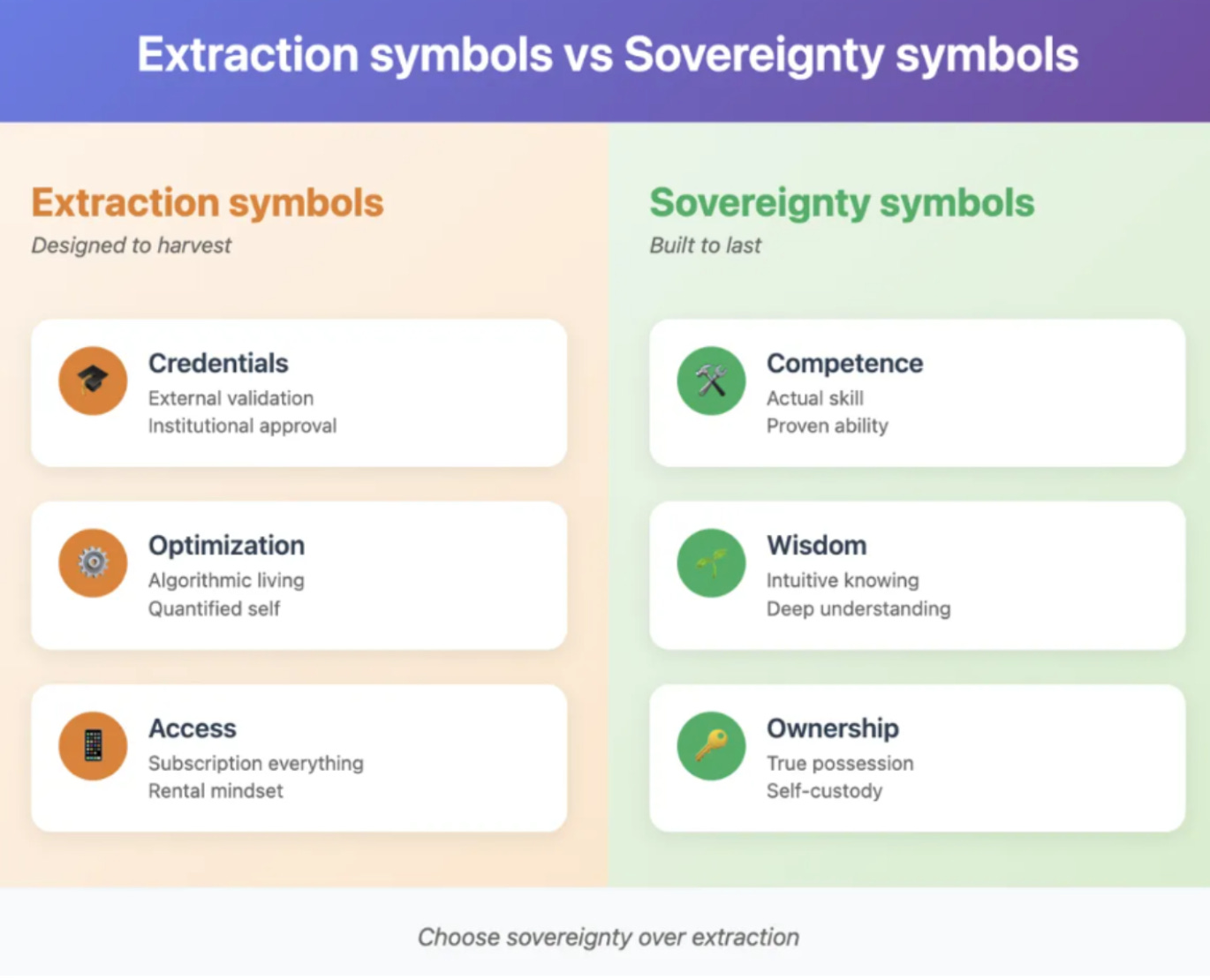 We’ve been conditioned to chase extraction symbols—external markers of success that actually make us poorer: credentials over competence, optimization over wisdom, access over ownership. Meanwhile, we’ve been trained to ignore sovereignty symbols—the markers of actual independence: real skill, intuitive knowing, true possession.