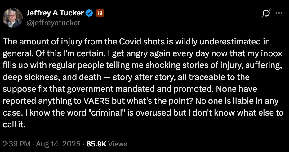 Tucker’s journey mirrors that of millions of us who’ve been peeling back the facade across every domain—from Covid policy to food systems to financial extraction. As founder of Brownstone Institute, what began as libertarian opposition to lockdowns evolved into recognition that the fight spans the entire spectrum of human experience. His recent acknowledgment that Covid vaccine injuries are ‘wildly underestimated’ exemplifies this awakening—moving from questioning individual policies to documenting systematic harm across institutions. As our collective Overton window shifts, more people are connecting dots across previously separate areas of concern.