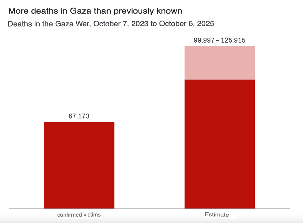 In the first two years of the war, from the Hamas attack on Israel on October 7, 2023, to October 6 of this year, between 99,997 and 125,915 people died or were killed in the fighting in the Gaza Strip. The researchers’ median estimate is 112,069 people. In addition, 1,983 Israelis were killed, according to the Israeli Ministry of Defense. These figures only include those who died directly as a result of the fighting, in most cases, from Israeli airstrikes.