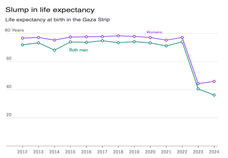 The model also suggests that life expectancy in Gaza plunged from about 42.3 years in 2023 to roughly 40.4 in 2024, reflecting a staggering loss of 36 years in the counterfactual world without conflict.