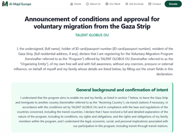 Al Jazeera has reported that Israel is moving Palestinians from Gaza to various other countries, labeling it as “Voluntary Migration.” To back up this assertion, the Qatari Broadcast shared a document that was archived on an earlier version of the Al-Majd Europe website. This document includes a letter titled “Announcement of conditions and approval for voluntary migration from the Gaza Strip,” which explicitly states that by accepting the terms and conditions, Palestinians utilizing Talent Globus’ services are consenting to voluntary migration.