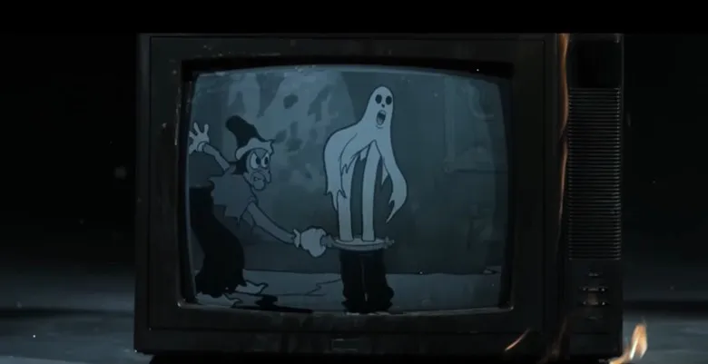 A paint brush layers a thick glob of black paint onto a blank canvas; a light shines on a chess piece; a sequence of dancing ghost cartoons and battlefields flash across the screen. “There is another force applied in combat that we genuinely don’t think of as a weapon of war. That weapon is words. Words are weapons,” declares the narrator against a backdrop of suggestive cartoons, war footage, and reels of ambiguous images.