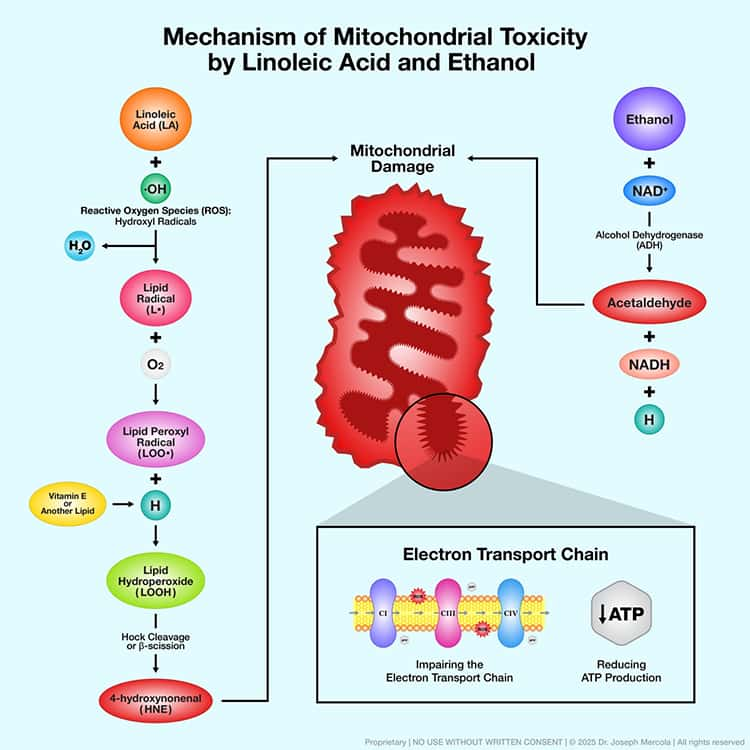 •Alcohol and LA both produce toxic aldehydes that destroy mitochondria — When you drink, your liver breaks ethanol into a highly reactive compound called acetaldehyde, which binds to proteins, lipids, and DNA, damaging your cells from the inside out. LA takes a nearly identical route. As it oxidizes, LA forms another reactive molecule called 4-hydroxynonenal (4-HNE), a toxic aldehyde that behaves just like acetaldehyde.