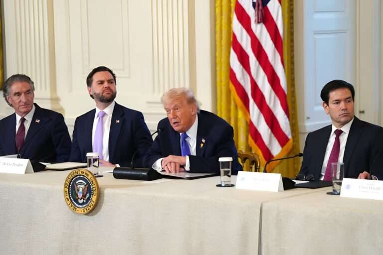 IMAGE: President Trump spoke during a meeting with oil and gas executives in the East Room of the White House on Friday. From left: Secretary of the Interior Doug Burgum, Vice President JD Vance, and Secretary of State Marco Rubio.(Source: TIERNEY L. CROSS/NYT)