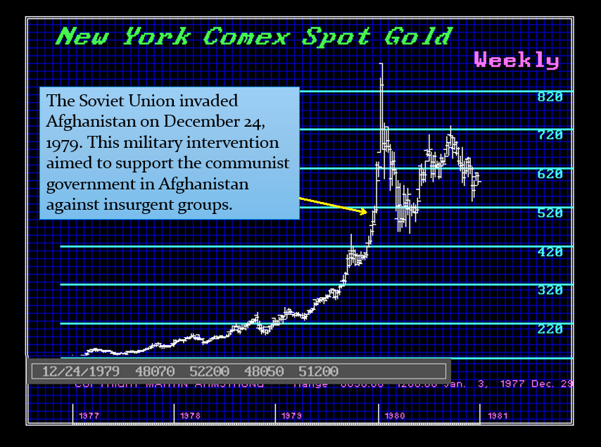 As I have explained many times, gold rallied into 1980 not because of inflation and the dollar, it rose from $480 to $875 on geopolitical events when the Soviet Union invaded Afghanistan to support a fellow Communist government against the rise of insurgents on December 24th, 1979. Gold peaked January 21st, 1980 at $875 cash.