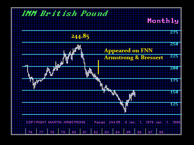 I was doing a TV spot I think in 1982. It was FNN that became CNBC. I was doing an interview with Walter Bressert. I gave our forecast that the British pound would fall to par by 1985. The pound was near the $2 level at the time so it was about a 50% drop. The host was shocked. He turned to Walt and asked – “What do you think about that forecast?” Walt and I were good friends. He replied, “I would not bet against his computer.”