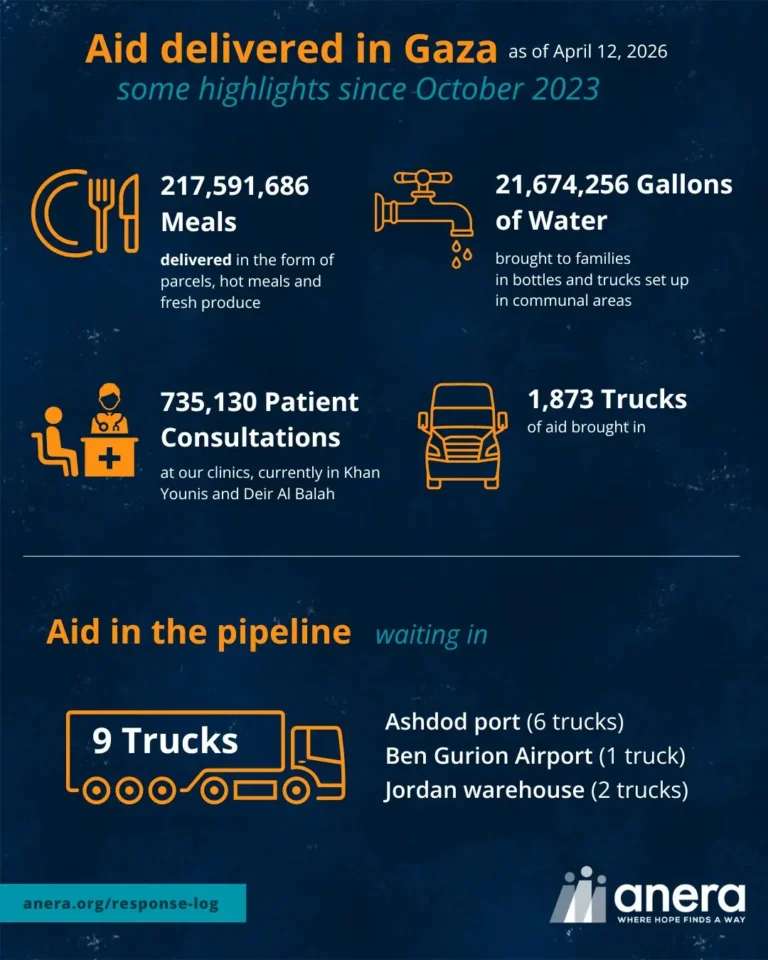 In an April infographic, Anera summarises its work since October 2023, listing large cumulative totals for meals, water, and consultations, but it also shows only nine trucks in the pipeline at that moment, a revealing snapshot of how thin the near‑term lifeline really is.