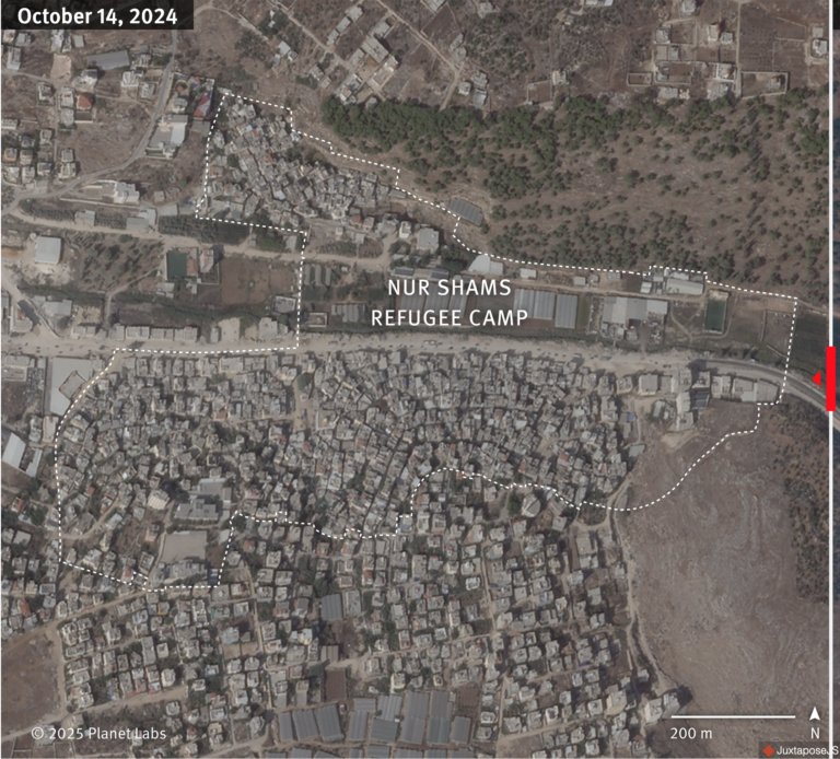 Satellite imagery recorded before and after the Israeli military raided Nur Shams refugee camp in February 2025 shows destruction within the refugee camp after six months of Israeli military operations. Before image: October 14, 2024 © 2025 Planet Labs PBC. After image: July 24, 2025 © 2025 Planet Labs PBC. Camp boundaries (2017): Palestinian Central Bureau of Statistics (PCBS), accessed on September 5, 2025.
