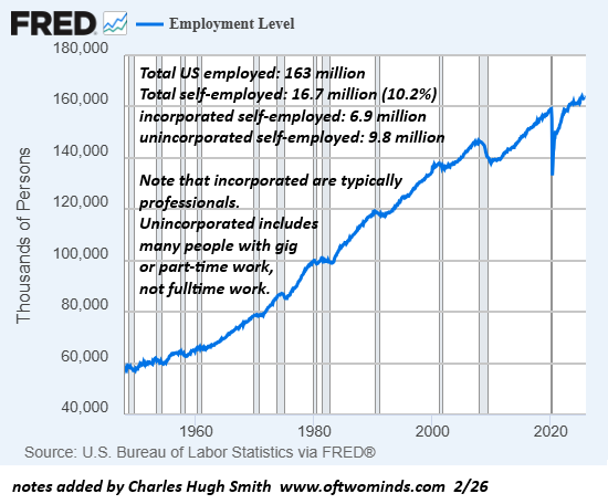 This guest essay by longtime correspondent 0bserver describes the core dynamics of work in America and the global economy: if we don’t own our work, we only “rent” our income and the life it funds. I discuss the process of owning your work in my book Get A Job, Build a Real Career and Defy a Bewildering Economy. The system doesn’t make it easy to own your work, and this isn’t accidental.
