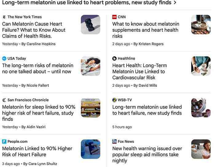 •Ji’s critique hinges on a single point — The AHA abstract was not a peer-reviewed study. He reiterates the AHA’s own words, saying “the findings are considered preliminary until published in a peer-reviewed journal.” However, mainstream media outlets treated the announcement as if it proved melatonin causes heart failure. Just look at the headlines he compiled in his Substack article: