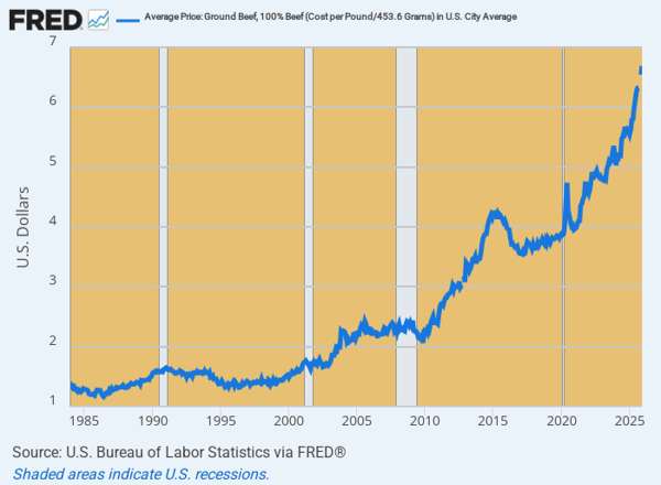 No more. At $6.69 per pound in December 2025, the price was up by +72% from where it stood on the eve of the pandemic in February 2020: In round terms, the cost of even hamburger meat has therefore risen at a 10% per annum rate for six years running.