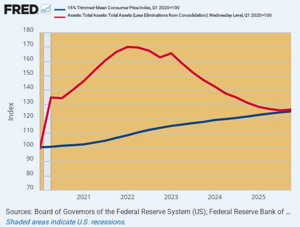 And on that score, both parties have spent like drunken sailors and urged/endorsed/endured the Fed’s printing press monetization of all that debt. As shown in the graph below, the Fed’s balance sheet is still up by 25% from its February 2020 level, and the 16% trimmed mean CPI is is also up by 25%.