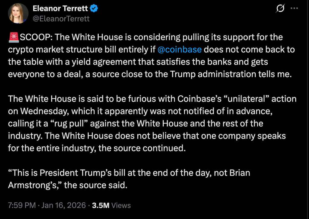 The White House threatened to drop support for the CLARITY Act in response to Coinbase withdrawing its support for the legislation, independent crypto reporter Eleanor Terrett reported on Saturday.