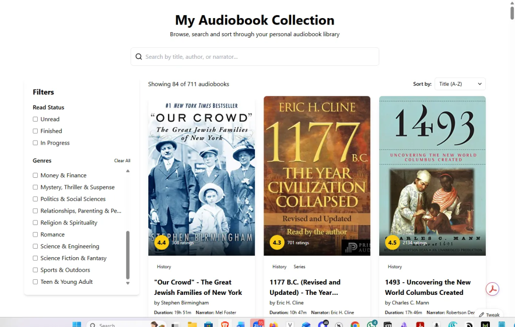 I own many thousands of books – some in digital print form and some in audio-digital form. One day as a project, I created a much better interface for my digital audiobooks than I can get from Audible alone.