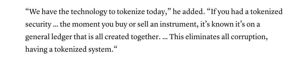 The CEO of the largest asset management firm in the world wants to tokenize every asset in the financial system so everything can be on a “general ledger” that is traceable.