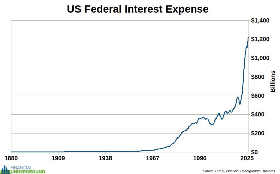 And every bond that comes due has to be refinanced at today’s much higher rates—locking in substantially larger interest costs for years. What used to roll over quietly can now only be rolled over at roughly double the interest cost seen in 2022.