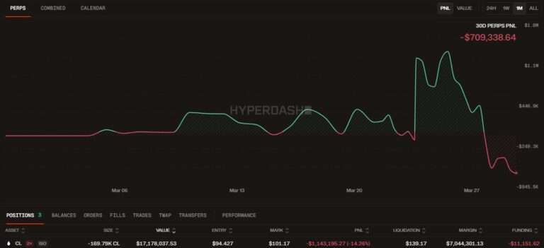 As the crisis deepened, Hyperdash‑based accounts that track Hyperliquid traders started publishing regular updates. The profile @hyperdashtrades highlighted rising exposure and losses in posts such as this 17 March update, which put the crude short alone near 23.6 million dollars, and a 23 March update that estimated total oil shorts around 47.7 million dollars across crude and Brent with combined floating losses around three million.