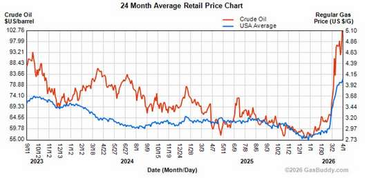 No more. It’s a global market where pricing pressures transmit rapidly accross markets and among various related elements of the hydrocarbon supply system. With global crude oil above $100 per barrel the domestic gas pump price is now at $4.03 per gallon for one reason and one reason only: The Donald kissed Bibi Netanyahu’s ass and joined his war of aggression not only against Iran but the entire Persian Gulf supply system for no good reason of America’s Homeland Security whatsoever.