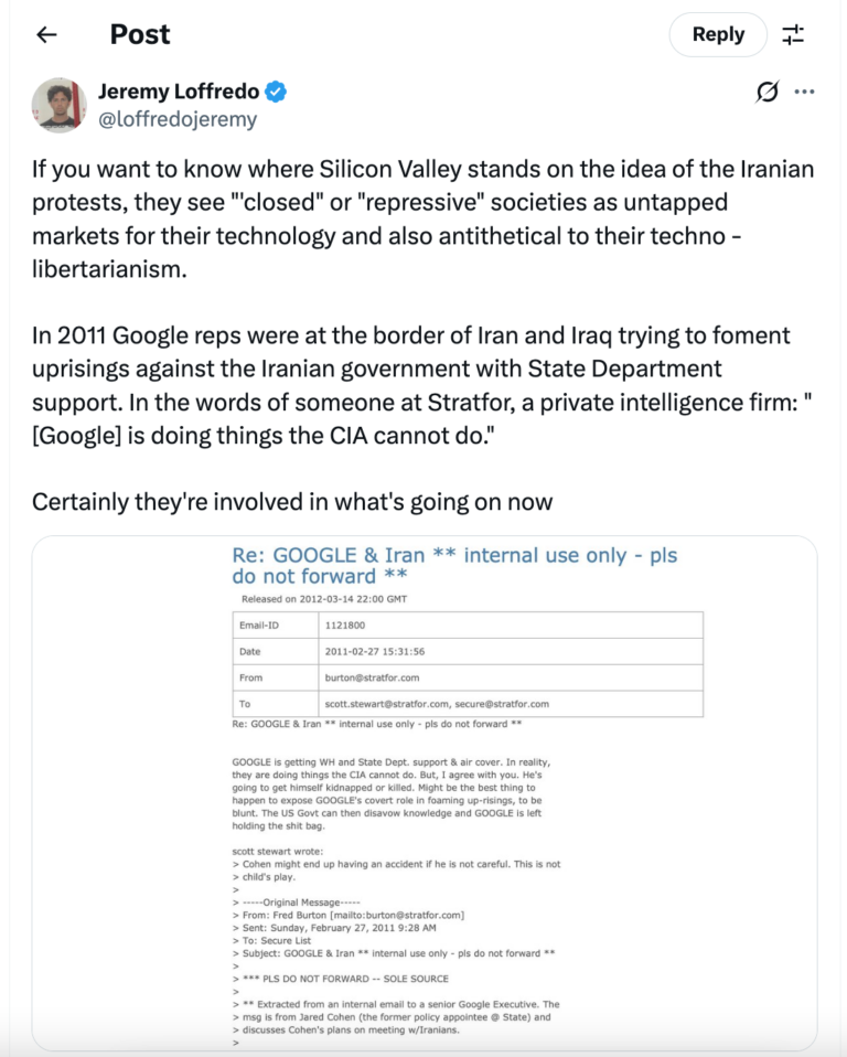 A 2011 Stratfor email, disclosed by journalist Jeremy Loffredo on X, reveals that in 2011, Google, under Jared Cohen’s Google Ideas (Google’s “civic tech” incubator), explored how social media fuels modern “color revolutions” (protests/uprisings) by amplifying US-funded ‘citizen journalism’, which became Jigsaw in 2016, was operating at the Iran–Iraq border doing “what the CIA cannot do,” allegedly with tacit support from the White House and State Department. Jigsaw was and still is dedicated to applying technological solutions, which can be used in operations aimed at countering extremism, online censorship, and cyber-attacks to protect (or control) access to information.