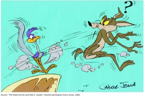 The danger here is our ill-informed confidence in AI and in what our system presents as rock-solid “knowable.” The system says Gross Domestic product (GDP) is a rock-solid measure of the economy, and since it’s rising, you can be absolutely confident about chasing gains (the Roadrunner) off the cliff. (See Wile E. Coyote below.)