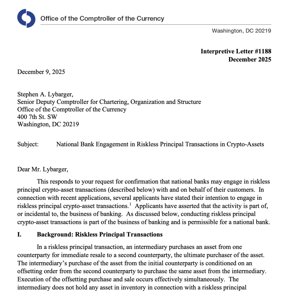 In an interpretive letter released on Tuesday, the regulator said banks may act as principals in a crypto trade with one customer while simultaneously entering an offsetting trade with another, a structure that mirrors riskless principal activity in traditional markets.
