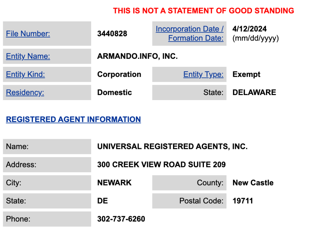 Though its staff operate from Bogota, Colombia, Armando.info is registered at a post office box in Newark, Delaware, where it is listed by Delaware’s Division of Corporations as “not in good standing.”