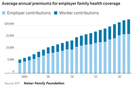Here is a chart of healthcare insurance costs. This doesn’t reflect the erosion of value generated by the expansion of co-pays, deductions and exclusions.