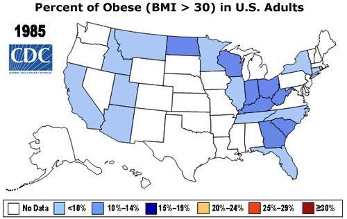 Here is the CDC map of obesity from 1985: