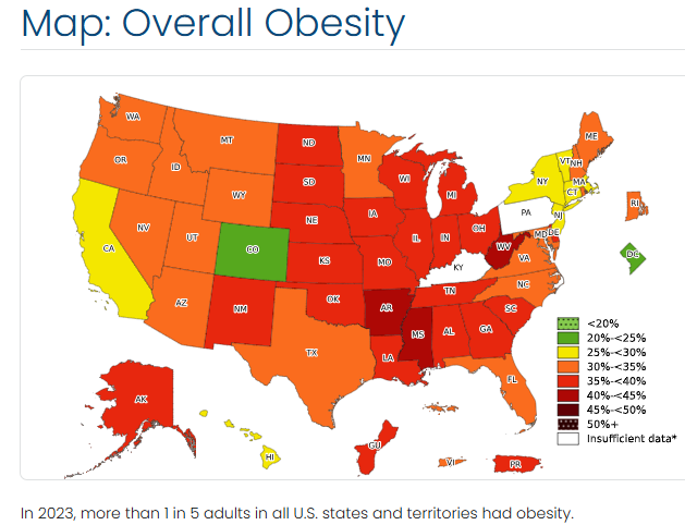 Here is the CDC map of obesity for 2023: