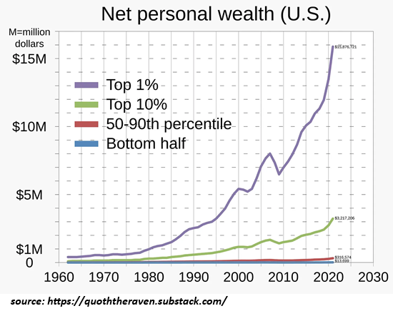 While our public infrastructure has decayed, private wealth has soared from $60 trillion in 2010 to $167 trillion in 2025. Measured by overall health and security, the top 10% are doing splendidly, having accumulated the majority of the $100 trillion in private wealth gains, while the bottom 60% are experiencing decay and decline.